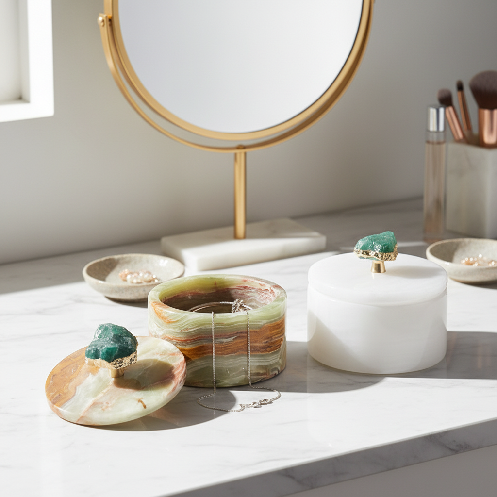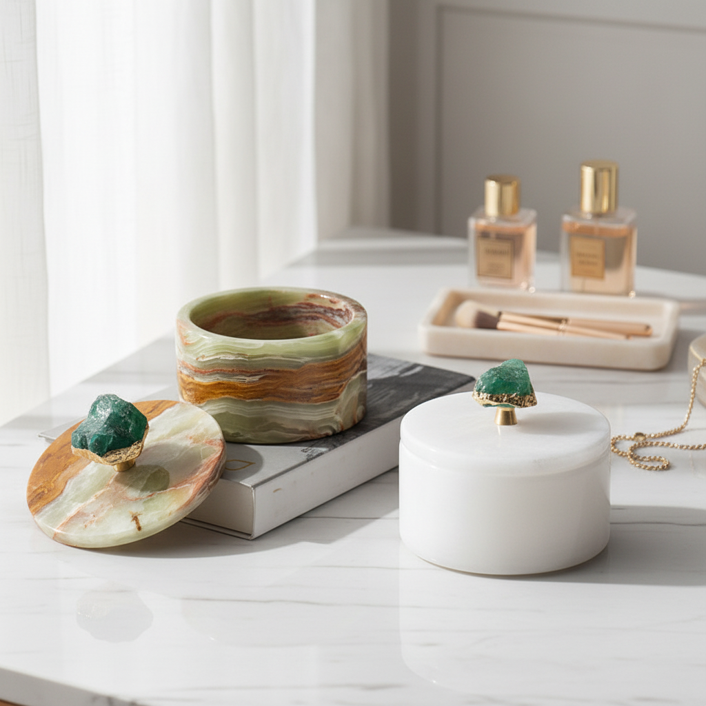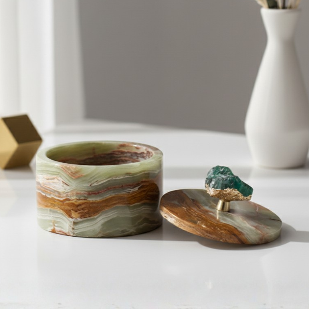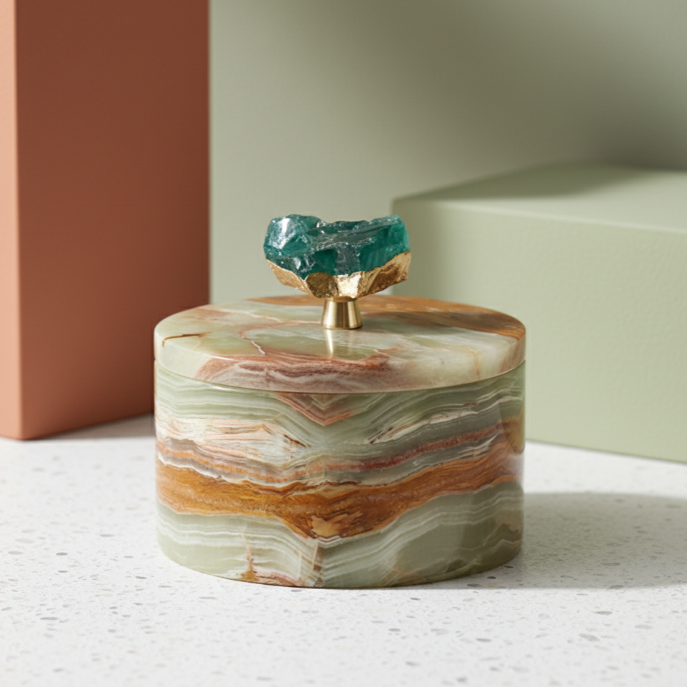 Perfekt, um Schmuck, Erinnerungsstücke oder kleine Essentials stilvoll zu organisieren, ergänzt dieses vielseitige Stück sowohl moderne als auch klassische Interieurs. Das beträchtliche Gewicht und die glatte Oberfläche zeugen von handwerklicher Kunstfertigkeit, während das Edelsteindetail einen auffälligen Blickfang für jeden Tisch oder Schminktisch schafft.